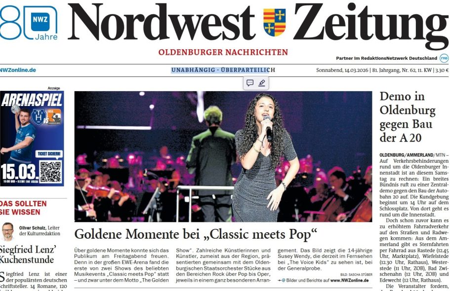 Die 14 jährige Jazz und Soul Sängerin Susey singt, den Song Halo von Beyonce, begleitet vom Oldenburger Staatsorchester , vor 5000 Zuschauern am Freitag, 13. März und ein weiteres mal am Samstag 14. März. Damit schaffte sie es direkt auf die Titelseite der Nordwest Nachrichten.